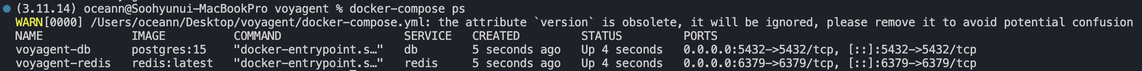 docker exec -it voyagent-db psql -U voyagent_user -d voyagent_db를 입력하면 psql에 접속할 수 있고, \dt를 입력하면 생성한 table이 보인다.