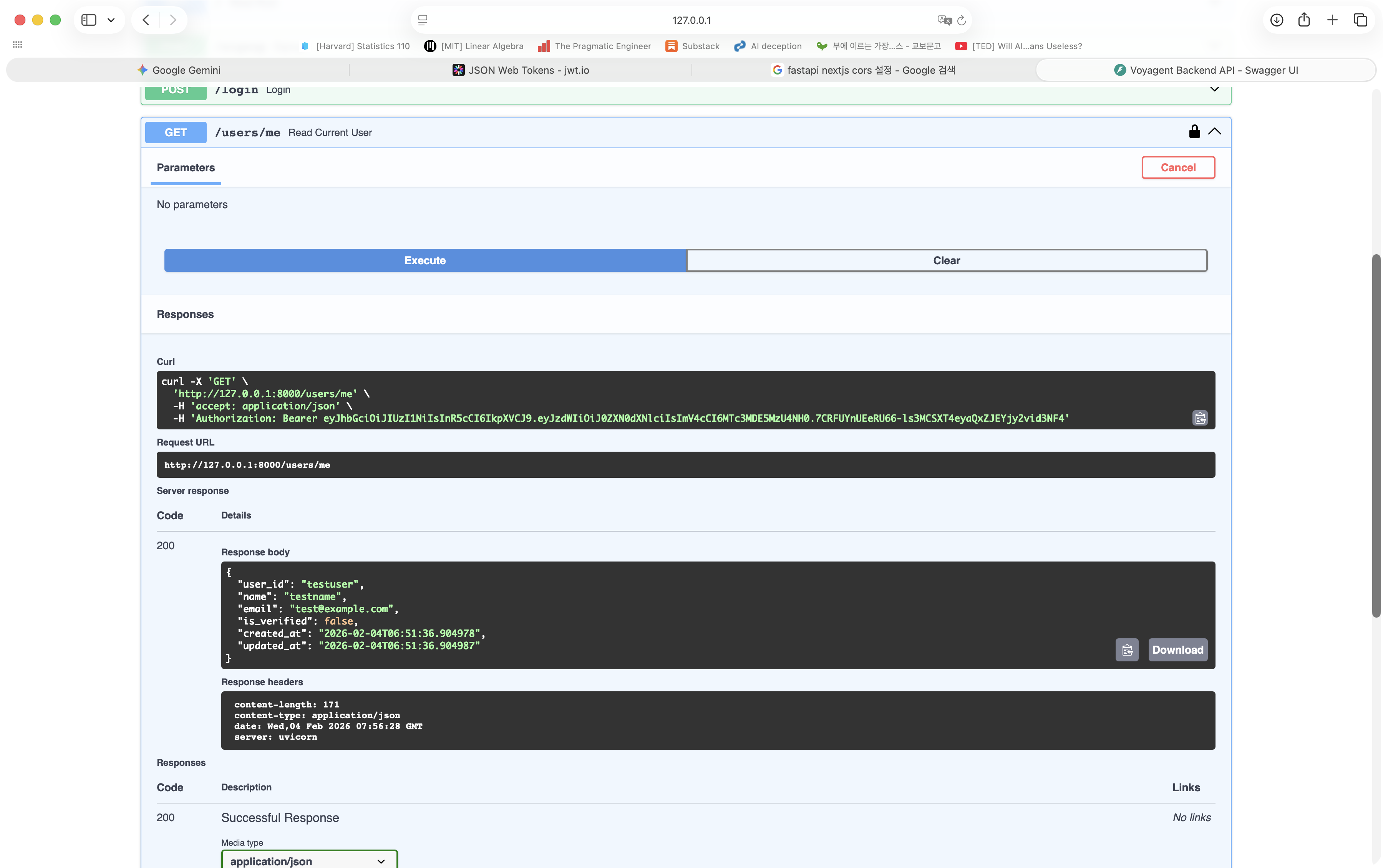 - OAuth 인증 화면이 나오고 창을 닫으면 아래와 같이 Header에는 token이, Body에는 UserRead의 객체가 반환된 모습을 확인할 수 있다.