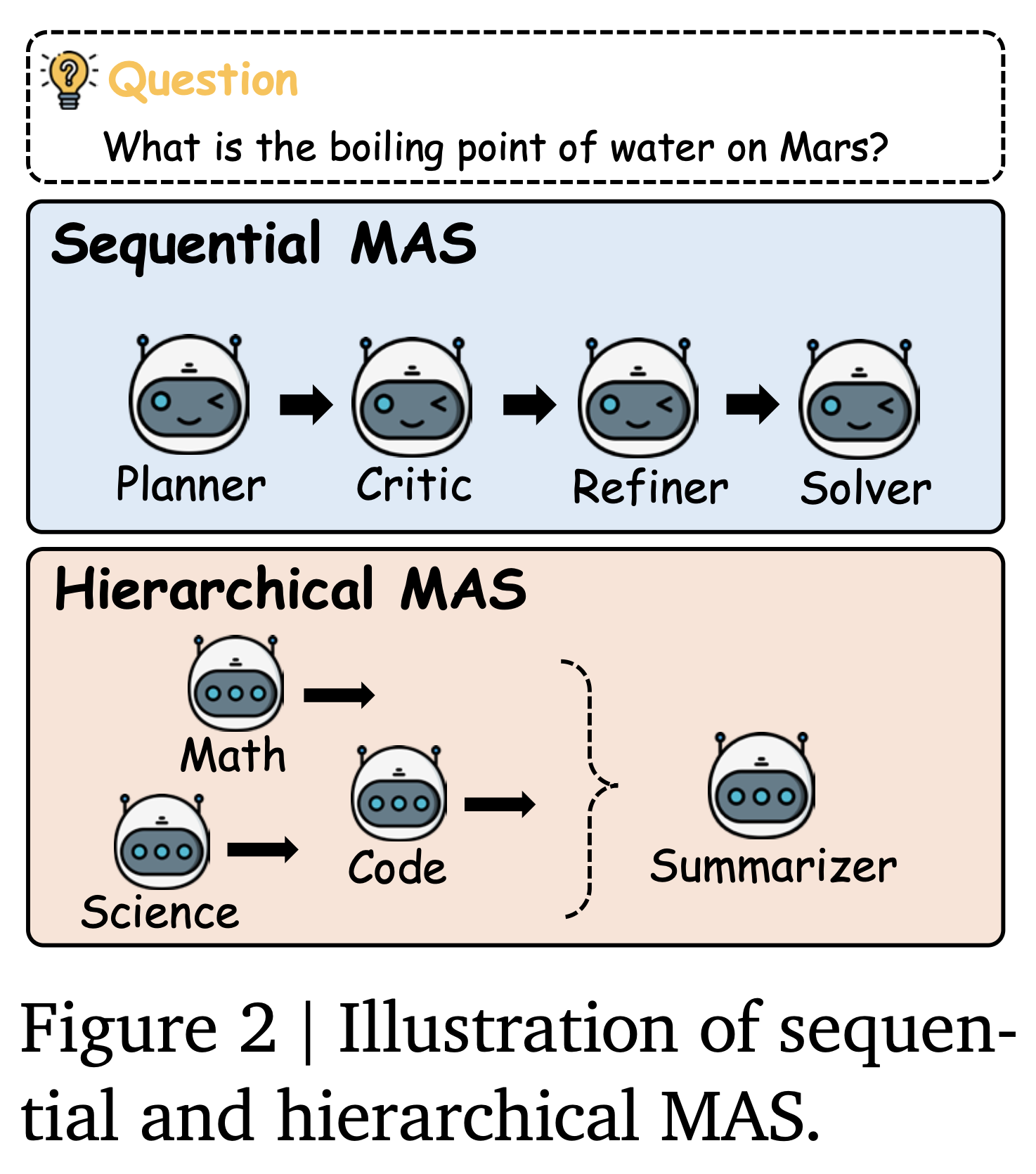 - Sequential text-based MAS (Sequential TextMAS): CoT 디자인을 따르는, 텍스트 기반의 추론과 소통을 하는 MAS