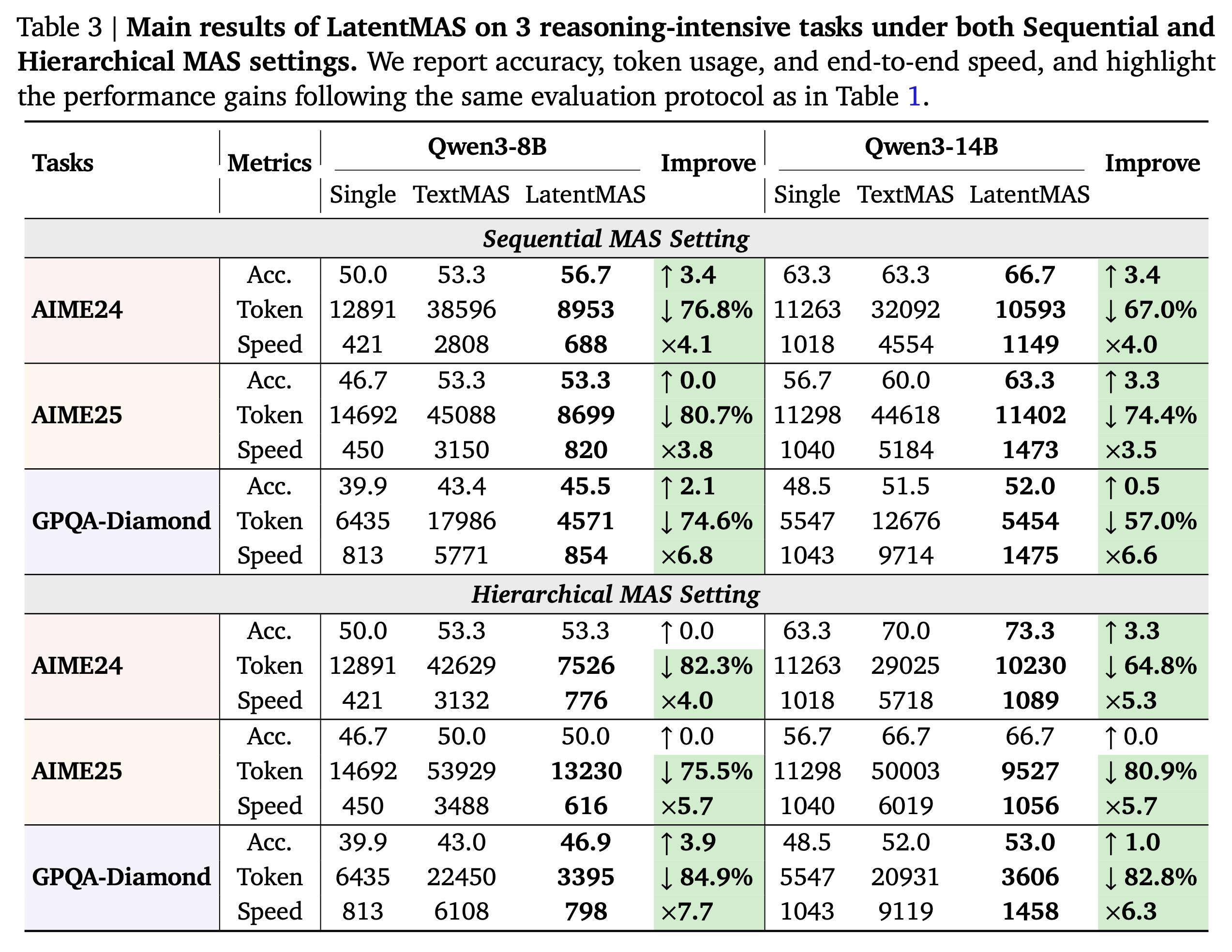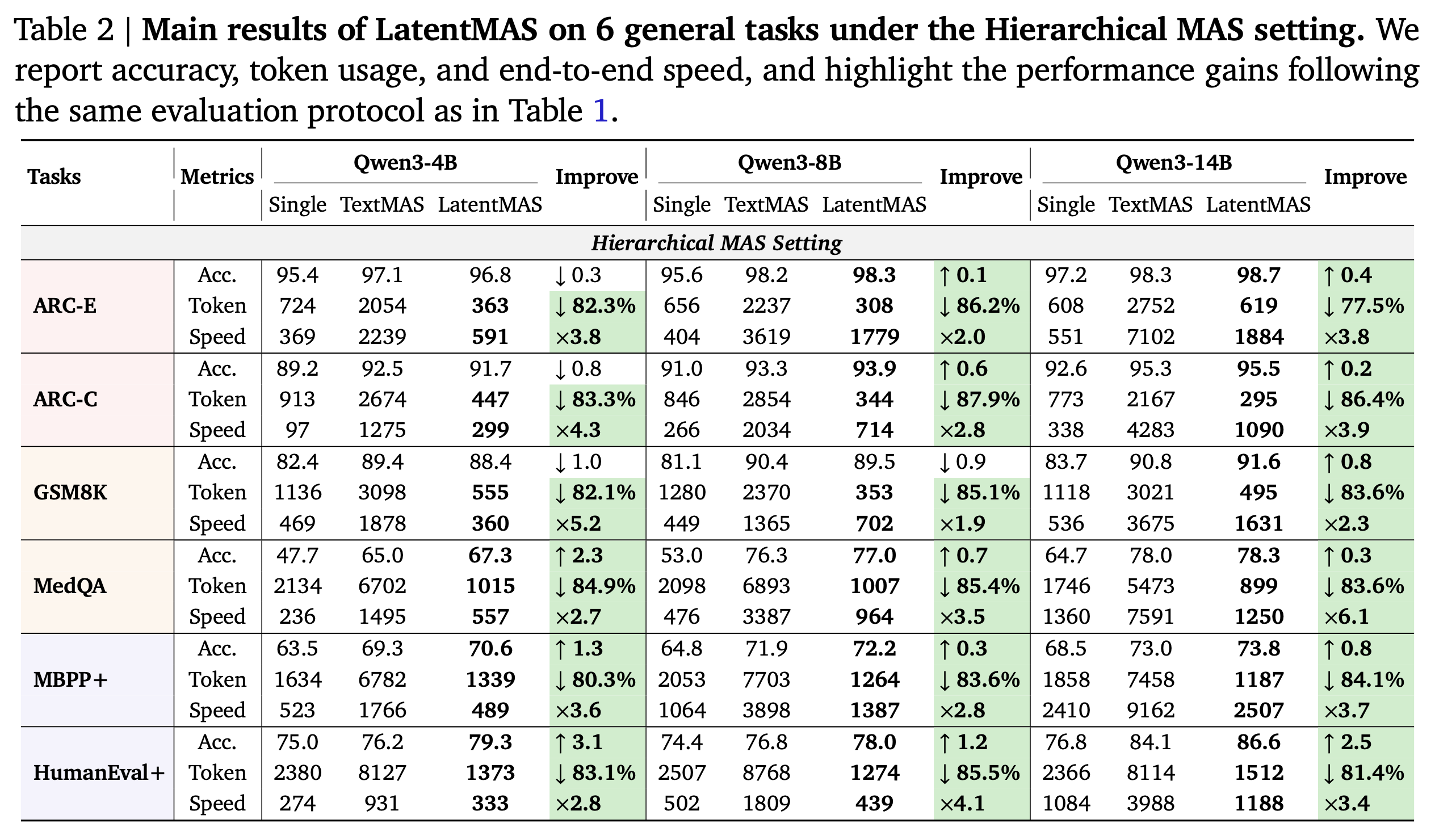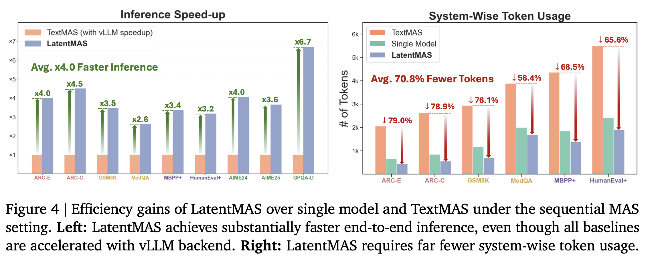 - LatentMAS는 이론과 실험 모두에서 텍스트 기반 MAS보다 훨씬 높은 효율을 달성