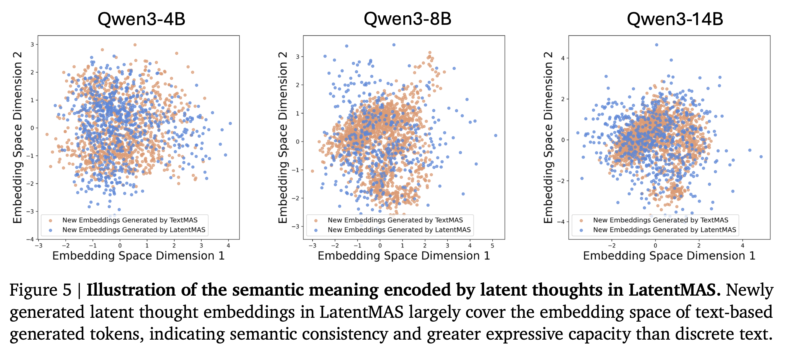 - LatentMAS의 마지막 은닉층의 임베딩이 TextMAS의 토큰 임베딩과 거의 동일한 영역을 공유함