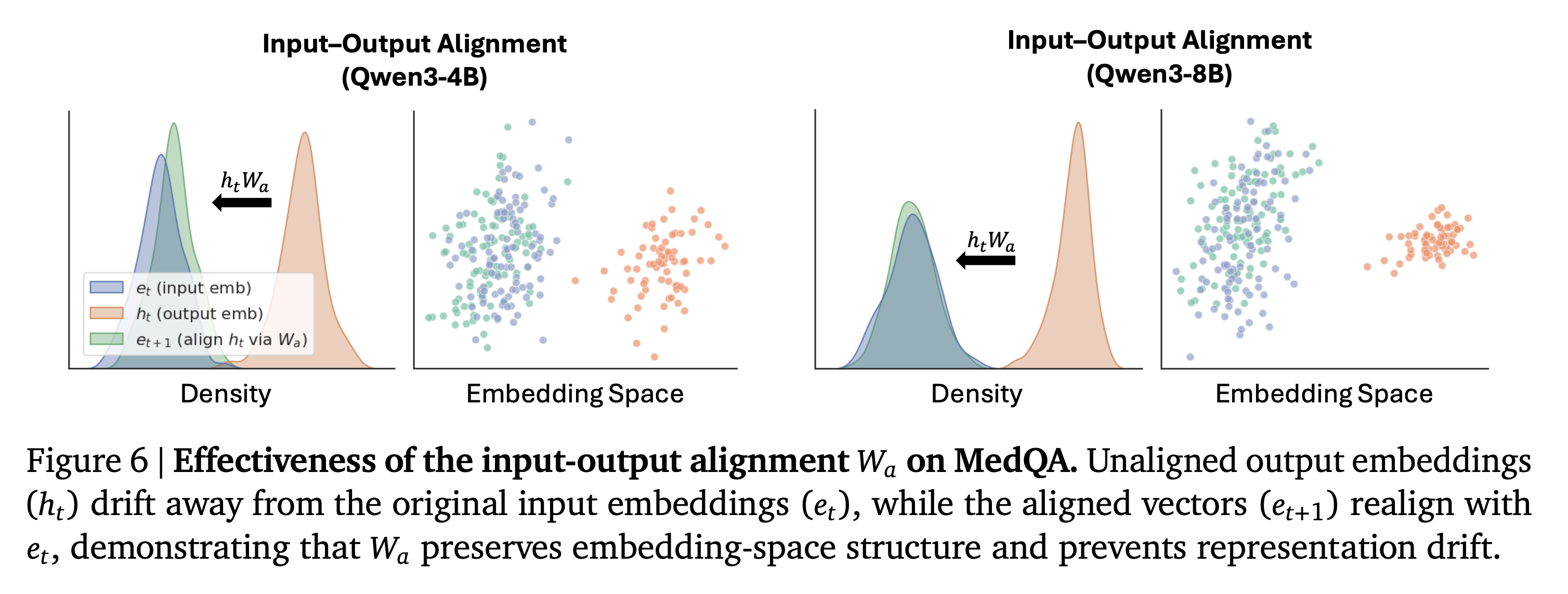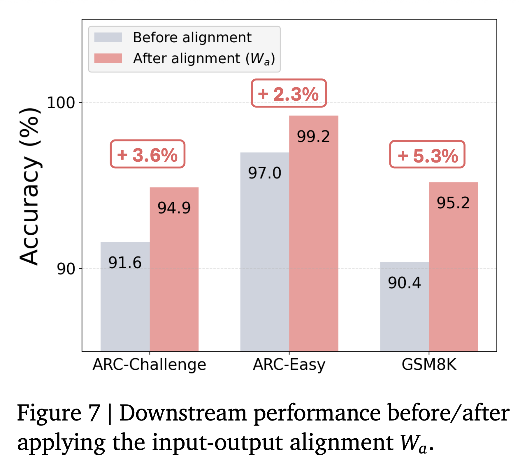 - 또한, align된 벡터 $e_{t+1}$ 을 적용했을 때, LatentMAS의 성능이 2.3-5.3% 향상됨
