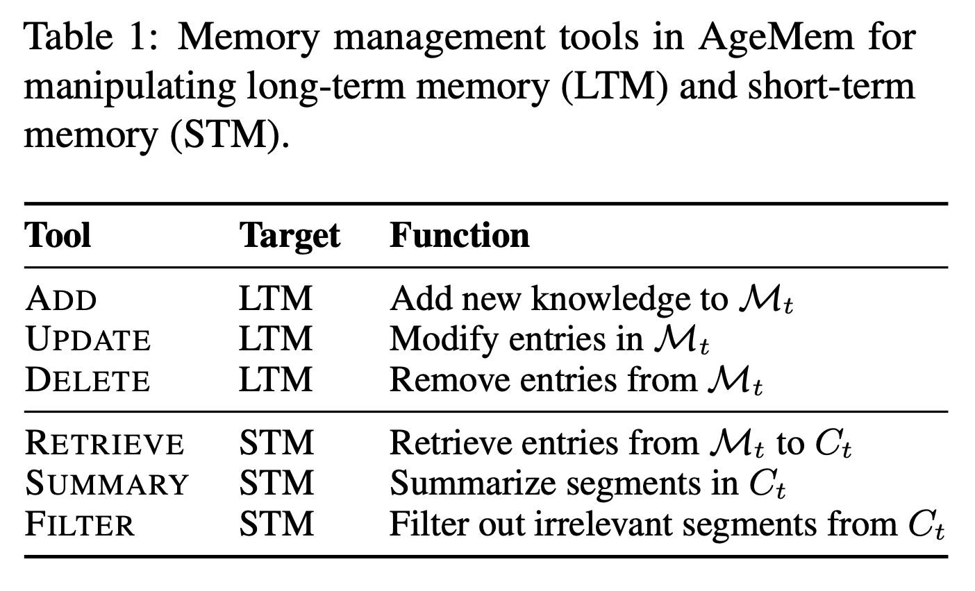 LTM은 정보에 대해서 store, update, discard를 결정하며, STM은 현재 활성화된 맥락에 대해서 retrieve, summarize, remove할 사항들을 결정한다.
