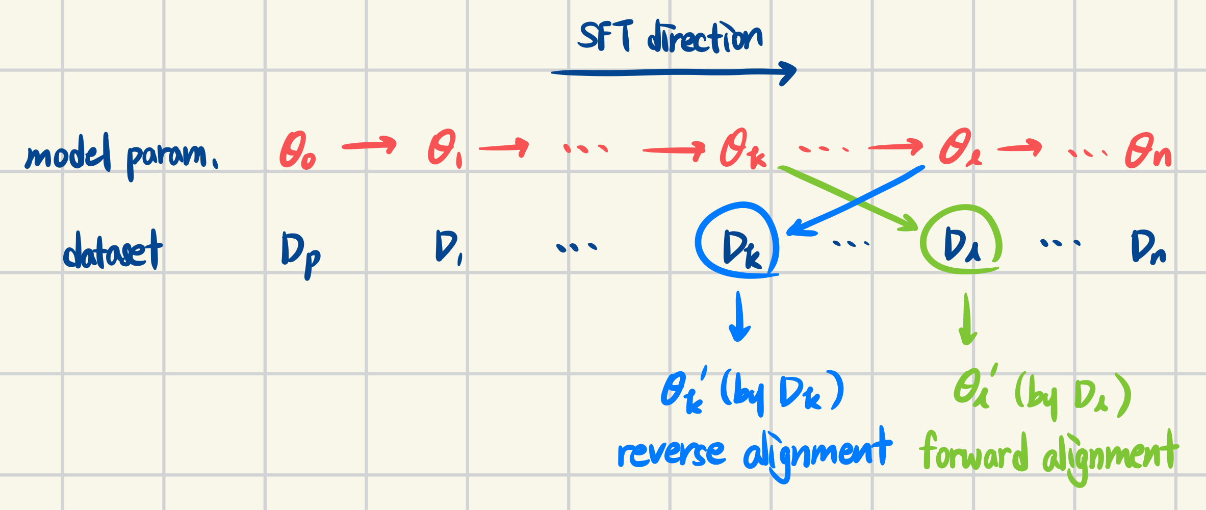 - Ex. pre-train ($\mathcal{D}_p$) → SFT 1 ($\mathcal{D}_1$) → SFT 2 ($\mathcal{D}_2$) 를 가정했을 때, pre-train만 수행한 모델과 $\mathcal{D}_p$ 의 분포 차이와 SFT 2까지 수행한 이후의 모델과 $\mathcal{D}_p$ 의 분포 차이는 $\mathcal{D}_1$ 과의 차이보다 작다는 것을 의미