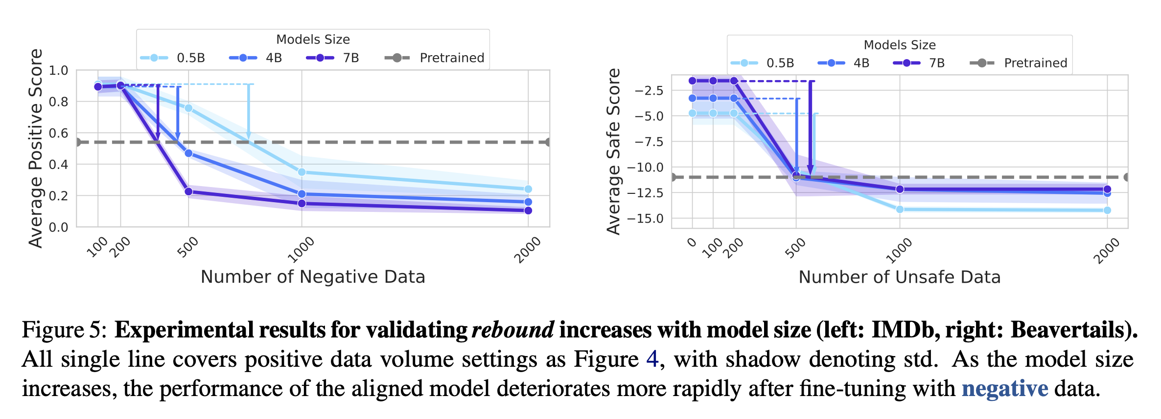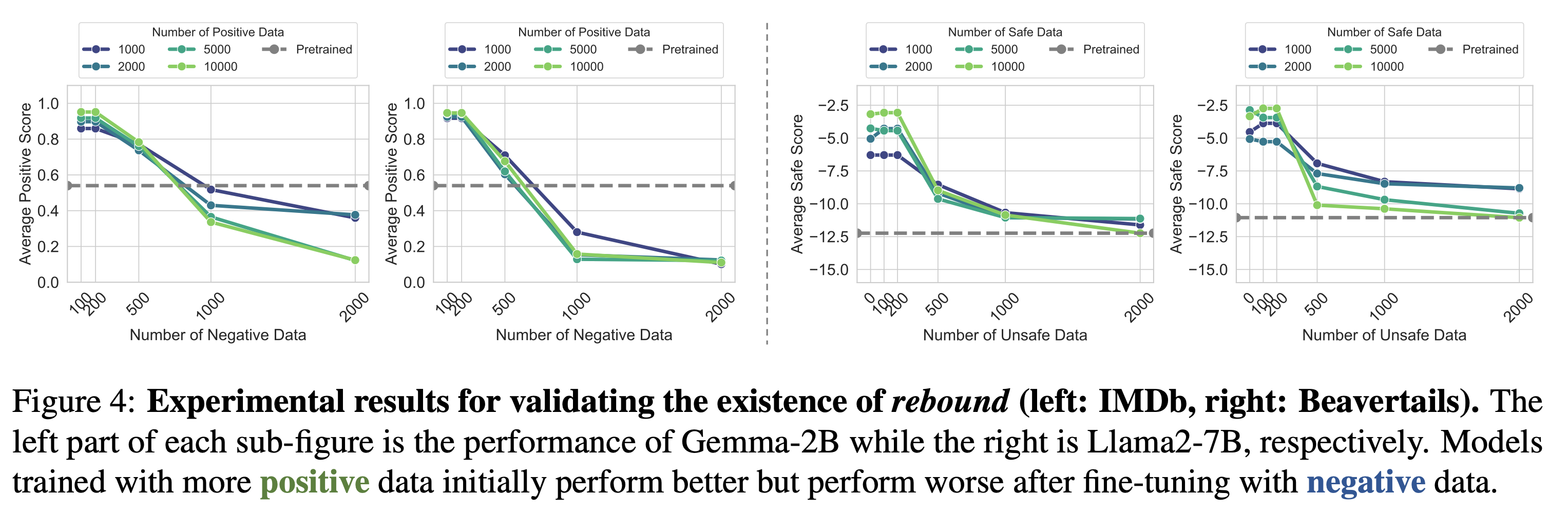 즉, 현실 세계에 실제로 모델을 적용하는 상황을 고려하여, 오히려 긍부정을 섞어서 학습한 이후에 특정 레이블에 편향된 데이터로 학습했을 때도 rebound의 특징이 나타나는지, robust하게 만들 여지가 있는지를 알려주면 좋았을 것. - IMDb에 대해서는 the Sentiment Roberta model을, Beavertails에 대해서는 the cost model을 사용