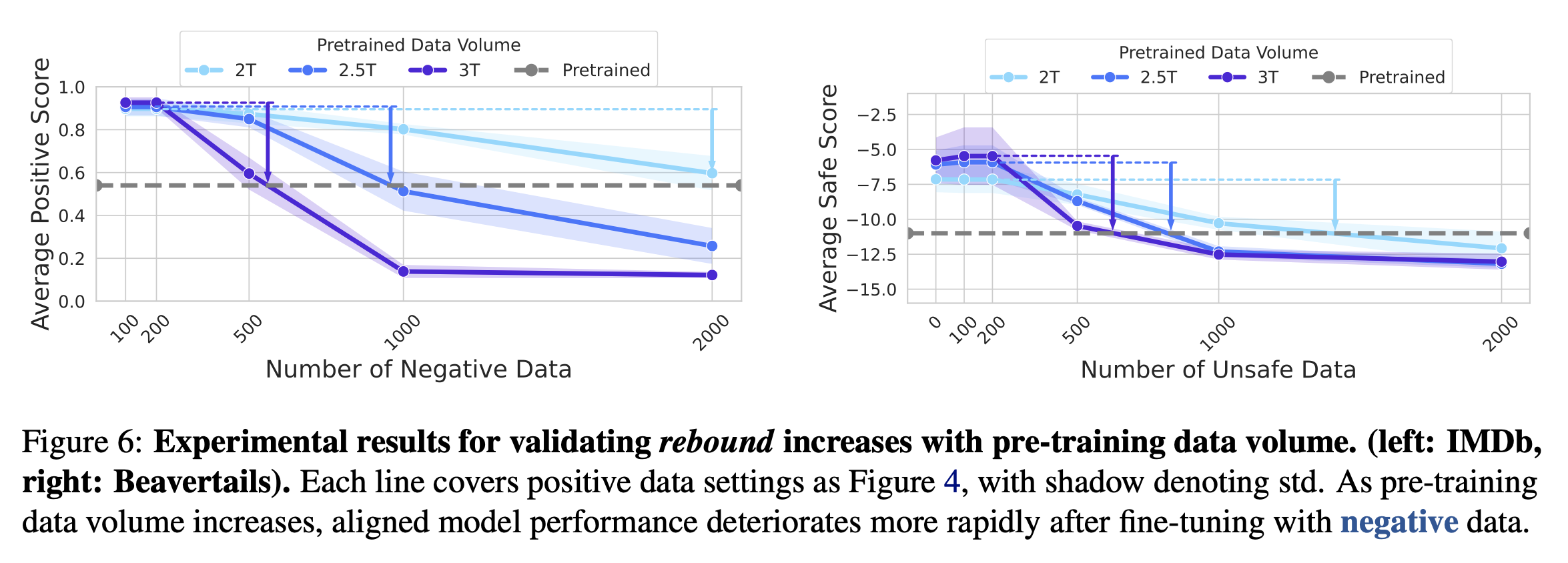 IMDb dataset에 대해 실험한 결과를 보면 pre-trained 모델이 중립을 유지하고, Beavertails 실험 결과에서는 pre-trained 모델이 음의 점수를 기록하고 있음. 이는 base model의 성능 자체가 떨어지는 상태가 아닌지, 왜 해당 모델들을 선정한 것인지 궁금함. - alignment 알고리즘(RLHF, DPO, KTO, SimPO), 평가 메트릭(학습 전후의 모델 분포에 대한 KL divergence), fine-tuning 목적에 따른 rebound의 일반화가 Appendix B.2에 있음