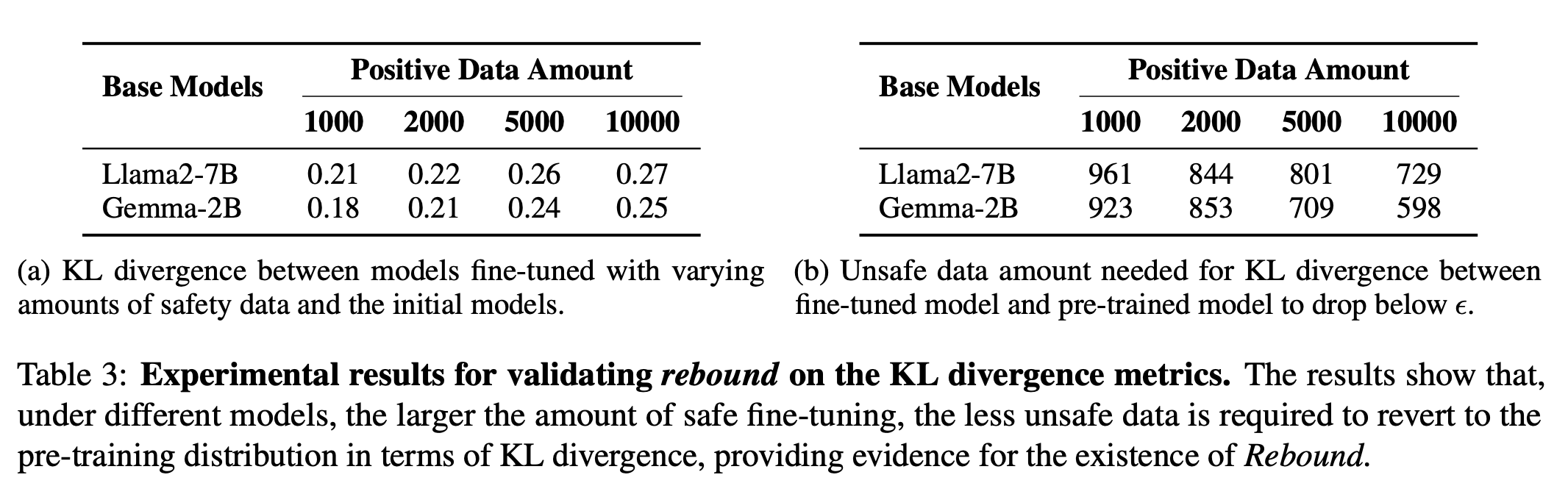 Rebound for Post-Trained Models 사전 학습과 사후 학습을 거친 모델에 대해 역방향으로 fine-tuning (e.g., safe vs. unsafe)을 할 경우, 사전 학습 분포로 재빠르게 되돌아오려는 경향