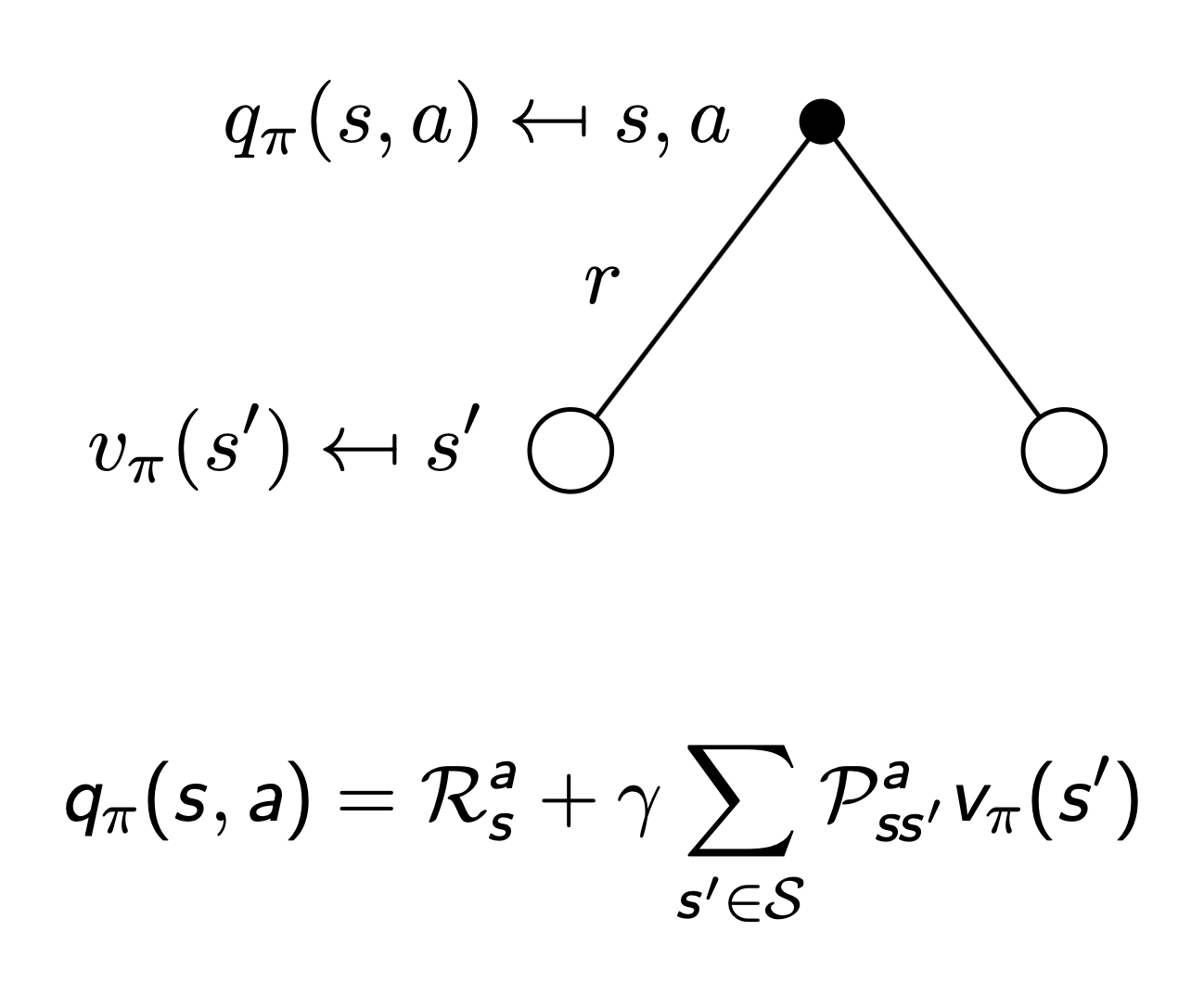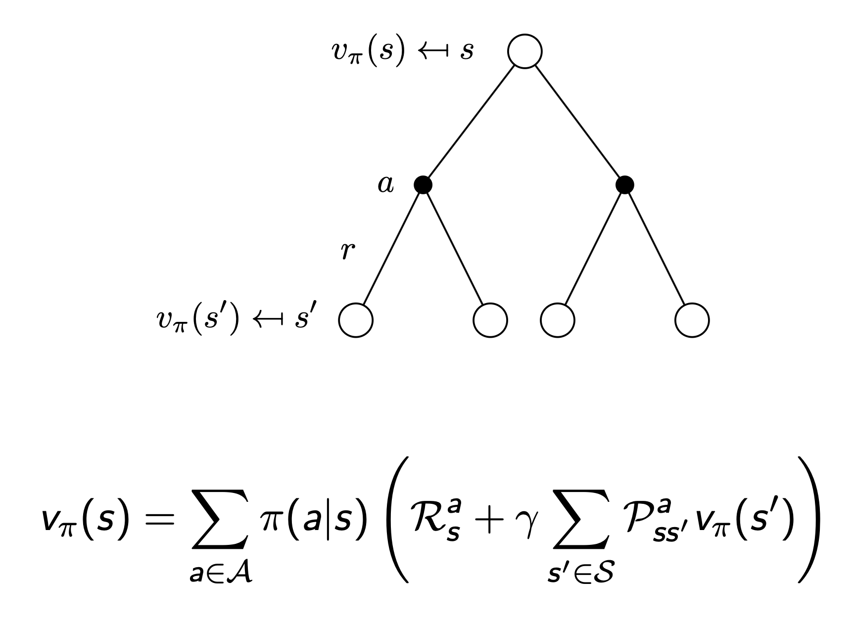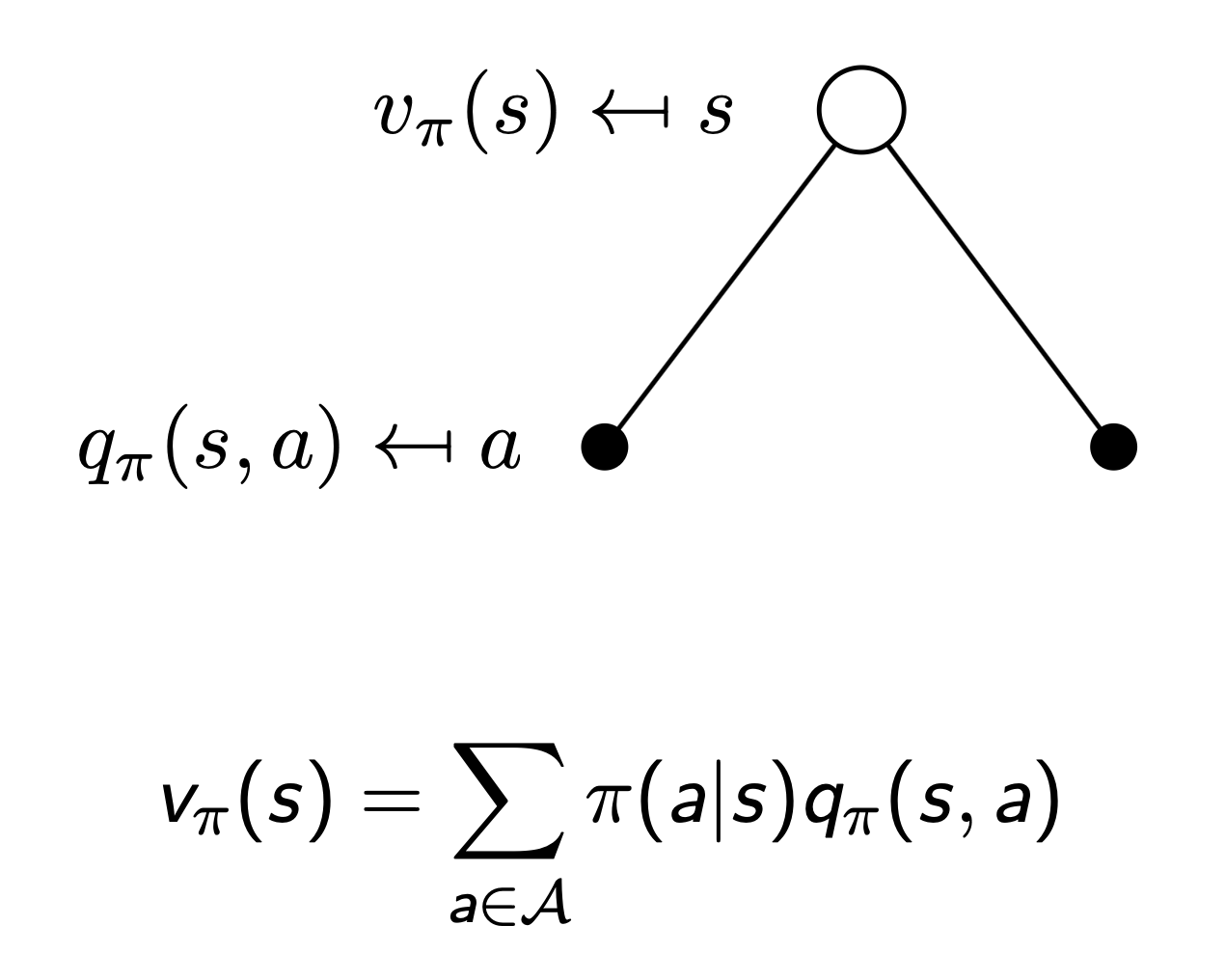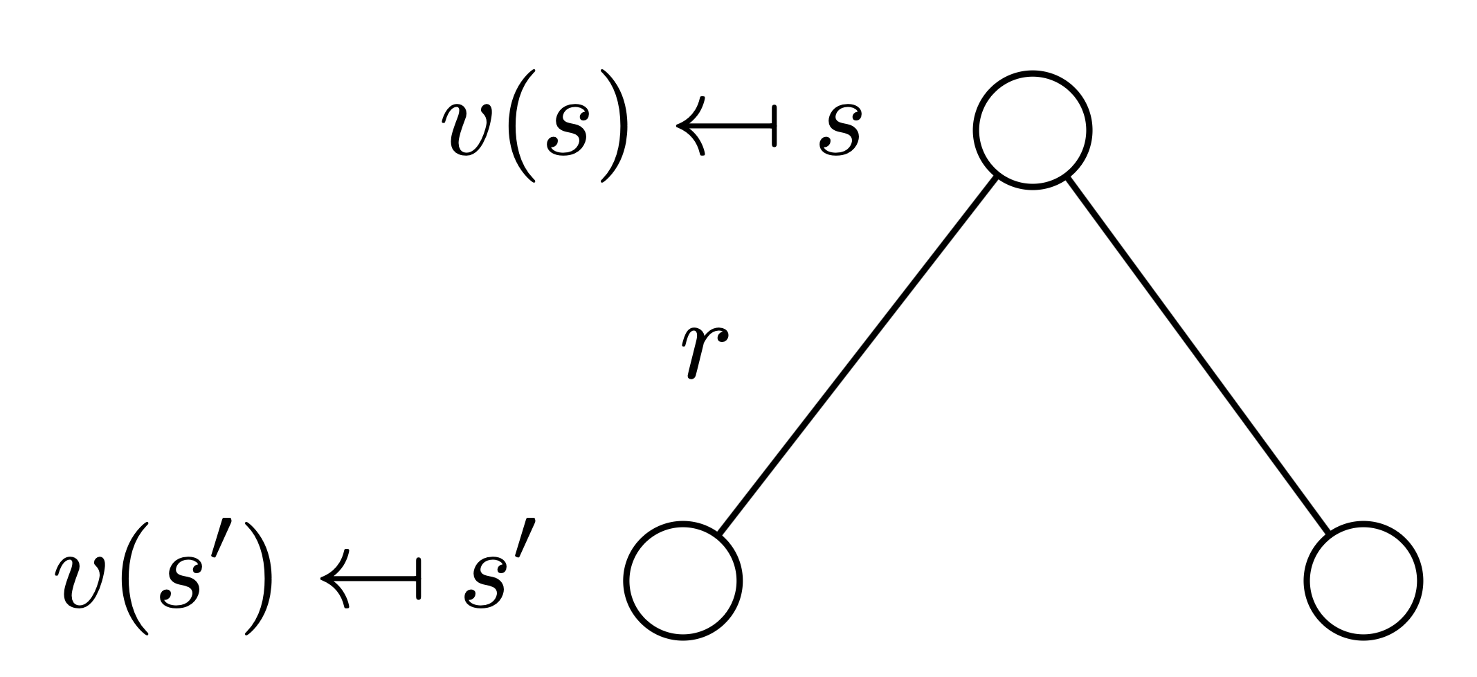 \[v(s) = \mathbb{E}[G_t | S_t=s] \\ = \mathbb{E}[R_{t+1} + \gamma R_{t+2} + \gamma^2 R_{t+3} + ... | S_t=s] \\ = \mathbb{E}[R_{t+1} + \gamma (R_{t+2} + \gamma R_{t+3} + ...) | S_t=s] \\ = \mathbb{E}[R_{t+1} + \gamma G_{t+1} | S_t=s] \\ = \mathbb{E}[R_{t+1} + \gamma v(S_{t+1}) | S_t=s] \\\]- 엣지가 한 개인 트리로 표현 가능