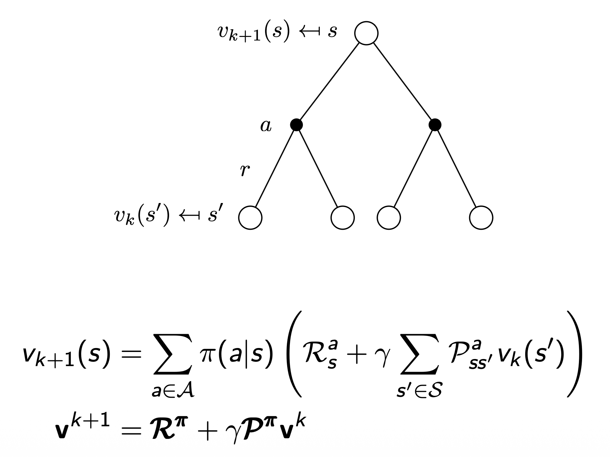 state $s$ 에서 action $a$ 수행 → 다음 모든 state $s’$ 들의 값을 사용해서 현재 state의 value fn. $v_{k+1}(s)$ 를 정확히 예측