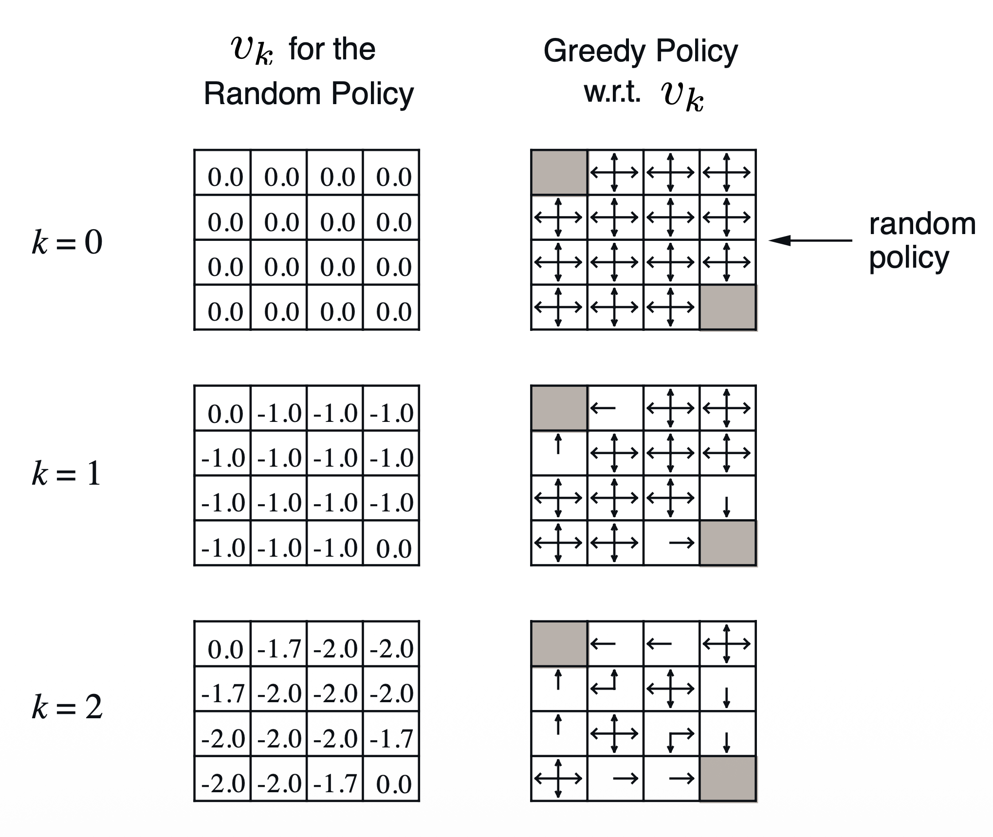 \[\pi ' = \text{greedy}(v_\pi)\]Small Gridworld에서 봤던 예제에서도 $\pi ‘ = \pi^$ 로 수렴함을 확인