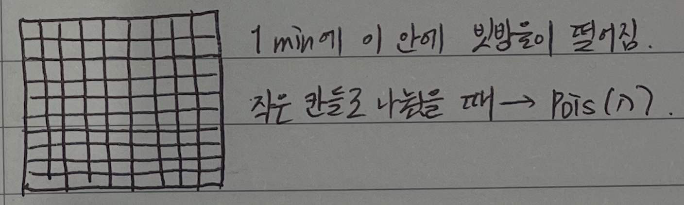 아래 그림과 같이 해당 공간을 무수히 많은 작은 사각형들($n \to \infty$)로 나눴을 때, 각 칸에 떨어지는 빗방울은 서로 독립이며, 각각 매우 작은 확률($p \to 0$)을 갖고 있다.