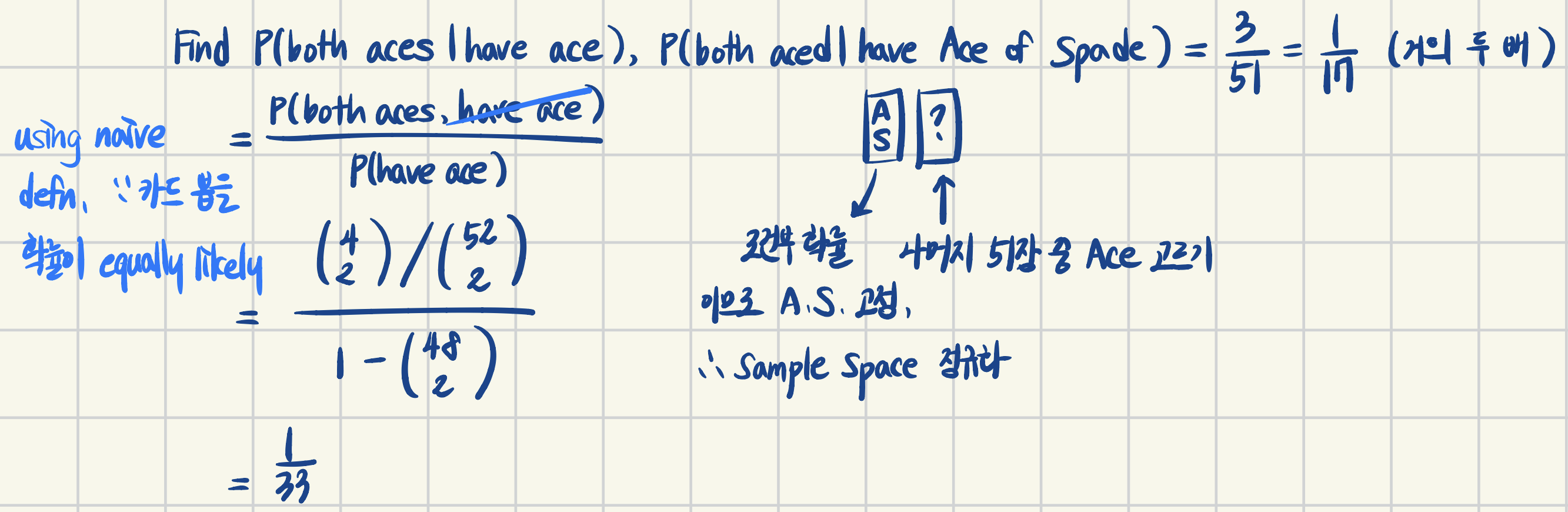 [Example 1] get random 2-card hand from standard deck, and find $P(\text{both aces} \vert \text{have ace})$, $P(\text{both aces} \vert \text{have ace of spade})$
