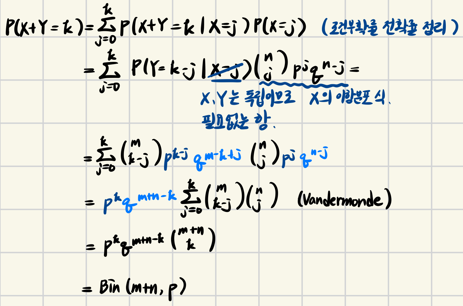 \[X \sim Bin(n, p), \ Y \sim Bin(m, p) \ \text{indep.} \Rightarrow X+Y \sim Bin(n+m, p)\](1) immediate from story: 첫 $n$개는 $X$의 성공 횟수, 이후 $m$개는 $Y$의 성공 횟수