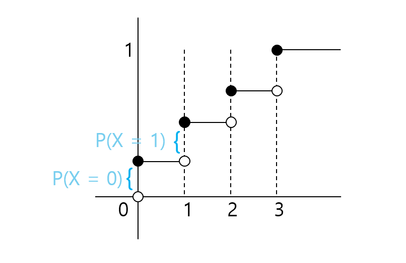 \[F(X) = P(X \leqslant x) \text{, as a function of real } x\]- $x=0$일 때 점의 위치가 $P(x=0)$