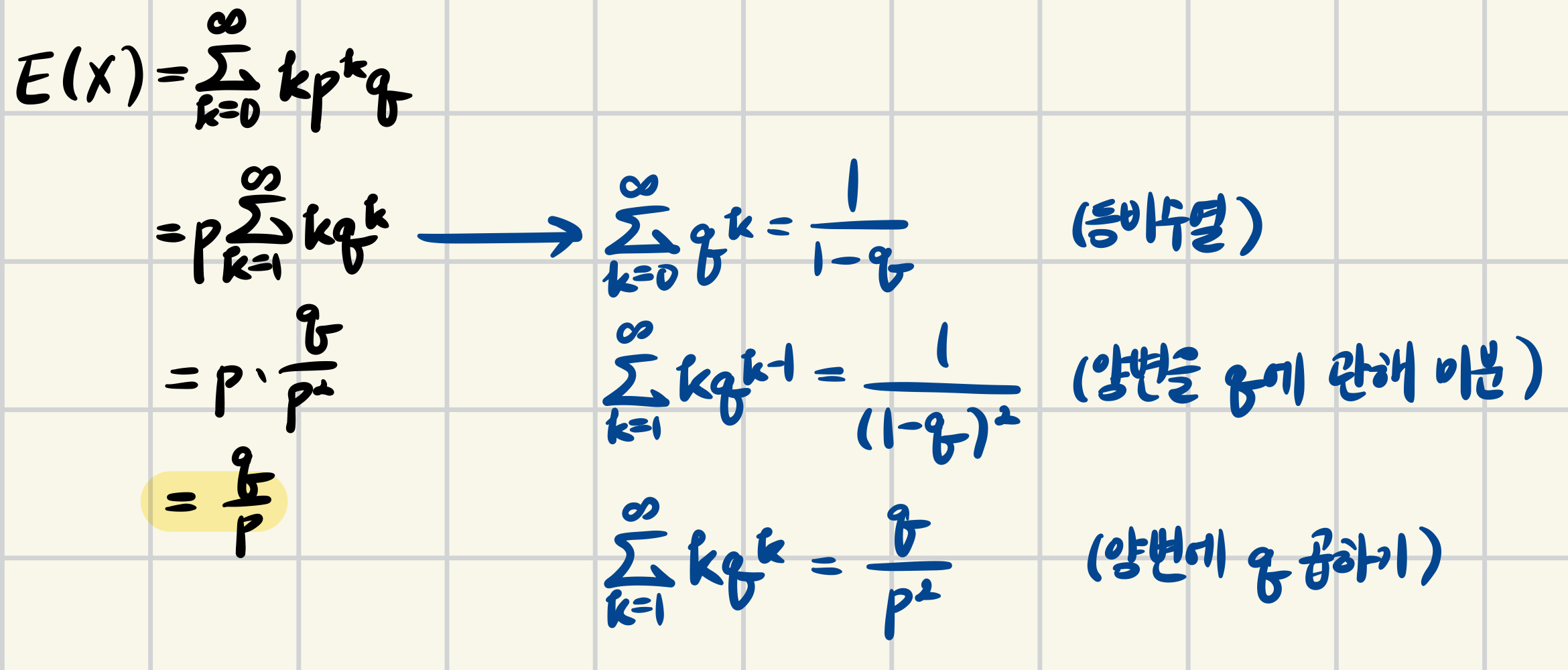 - $\displaystyle \sum^{\infty}_{k=0}pq^k = \frac{p}{1-q} = 1$
