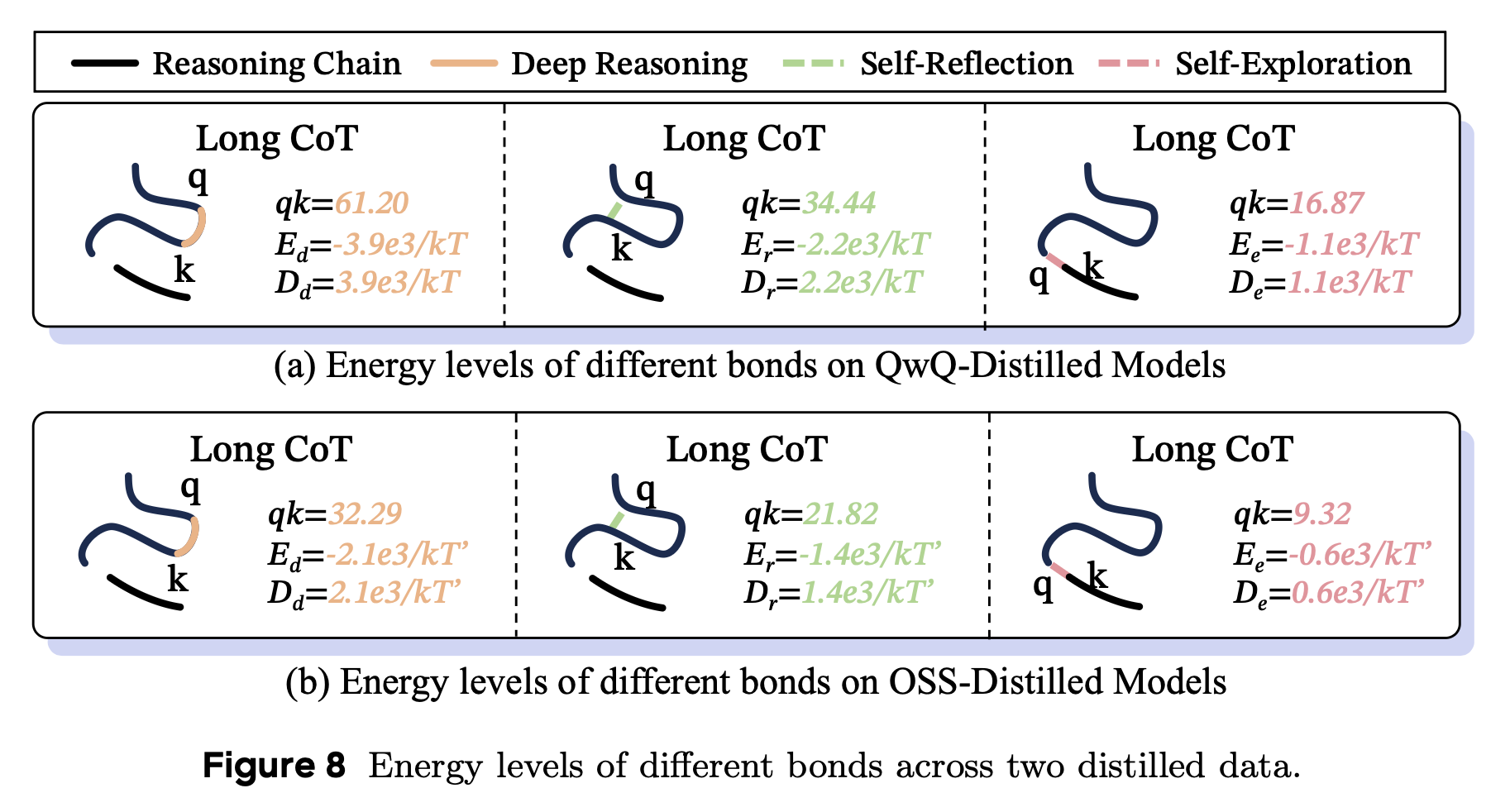 \[P(\text{state}_i) = \frac{\exp(-E_i/k_BT)}{\Sigma_j\exp(-E_j/k_BT)} \\ a_{ij} = \frac{q_i \cdot k_j/\sqrt{d_k}}{\Sigma_l\exp(Q_i \cdot k_l \sqrt{d_k})}\]reasoning 과정에서 다음 token과의 attention score를 통해 token 간 결합 관계를 파악했다.