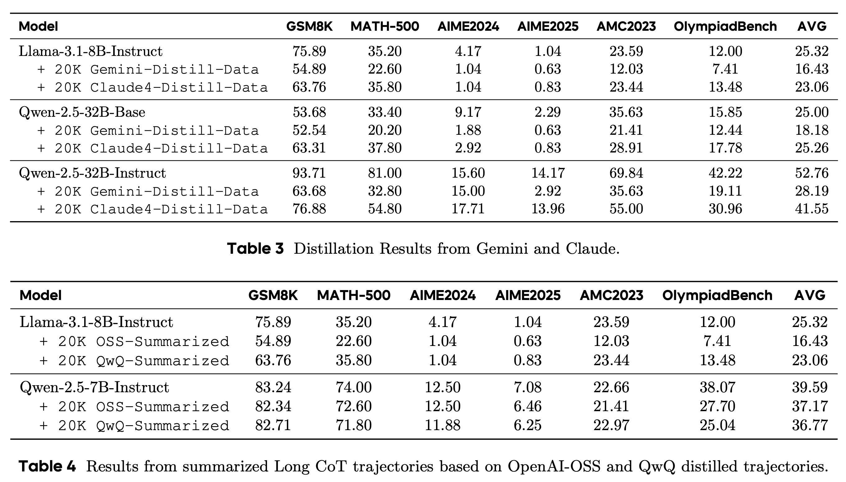 LongCoT의 reasoning structure를 원상태로 유지하지 않고, compression(Table 3)하거나 summarize(Table 4) 방식은 distillation 시 성능 저하를 일으킨다.